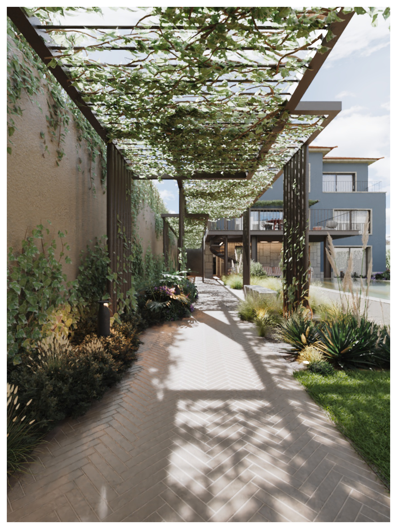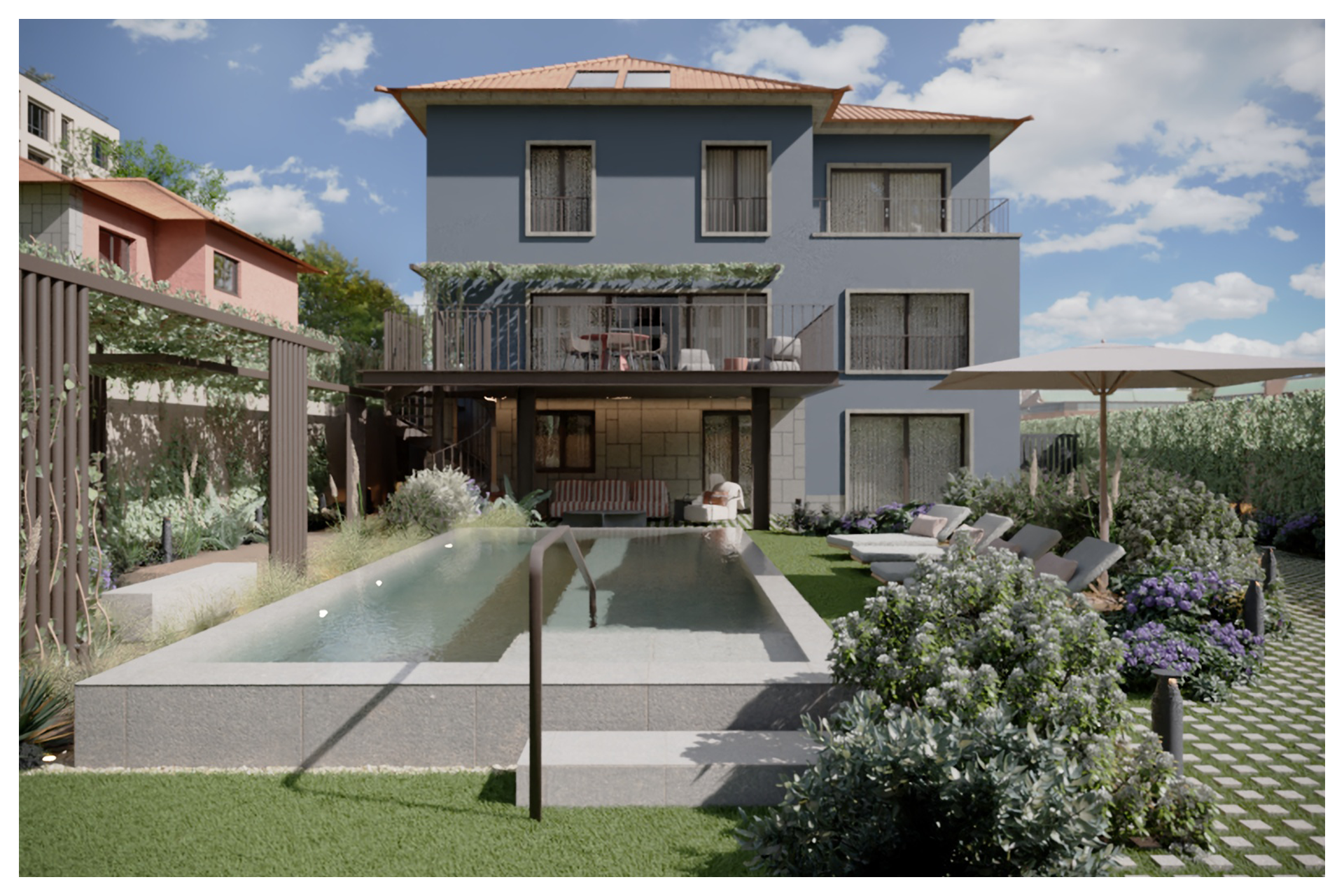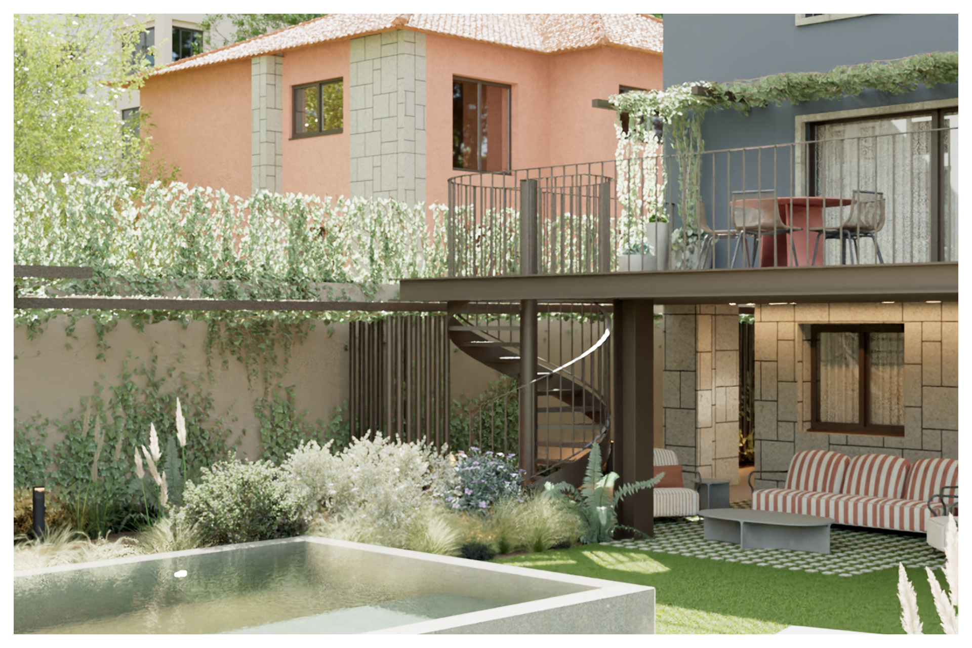 Architectural and landscape intervention in a single-family house located in the historic center of Guimarães, the birthplace of Portugal. The project introduces a sequence of moments for leisure and contemplation through carefully placed elements within the courtyards and garden. A vine-covered pergola over a Roman-style path, a stone water tank, a sunny porch, and fragrant vegetation compose a serene setting. A place designed for pause, sharing, and inspiration.