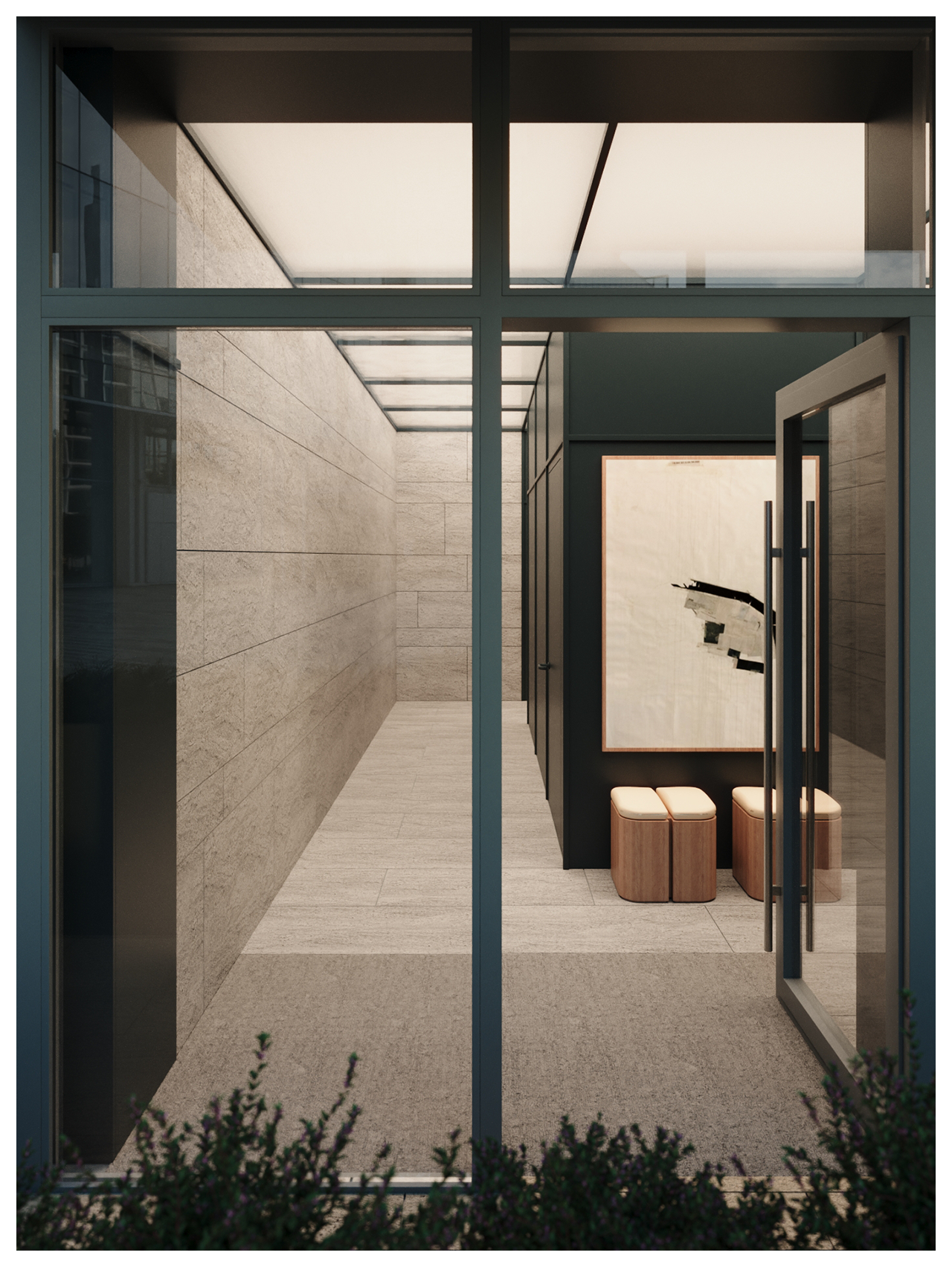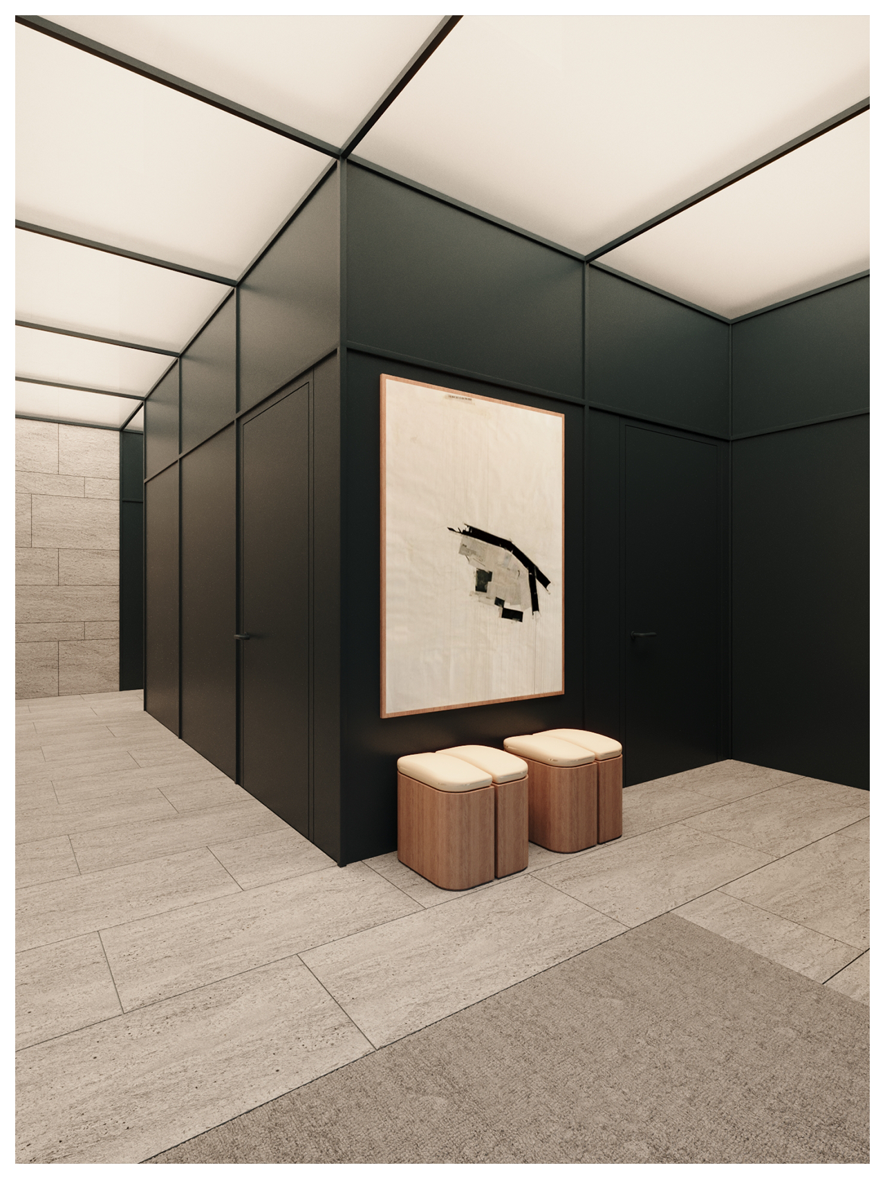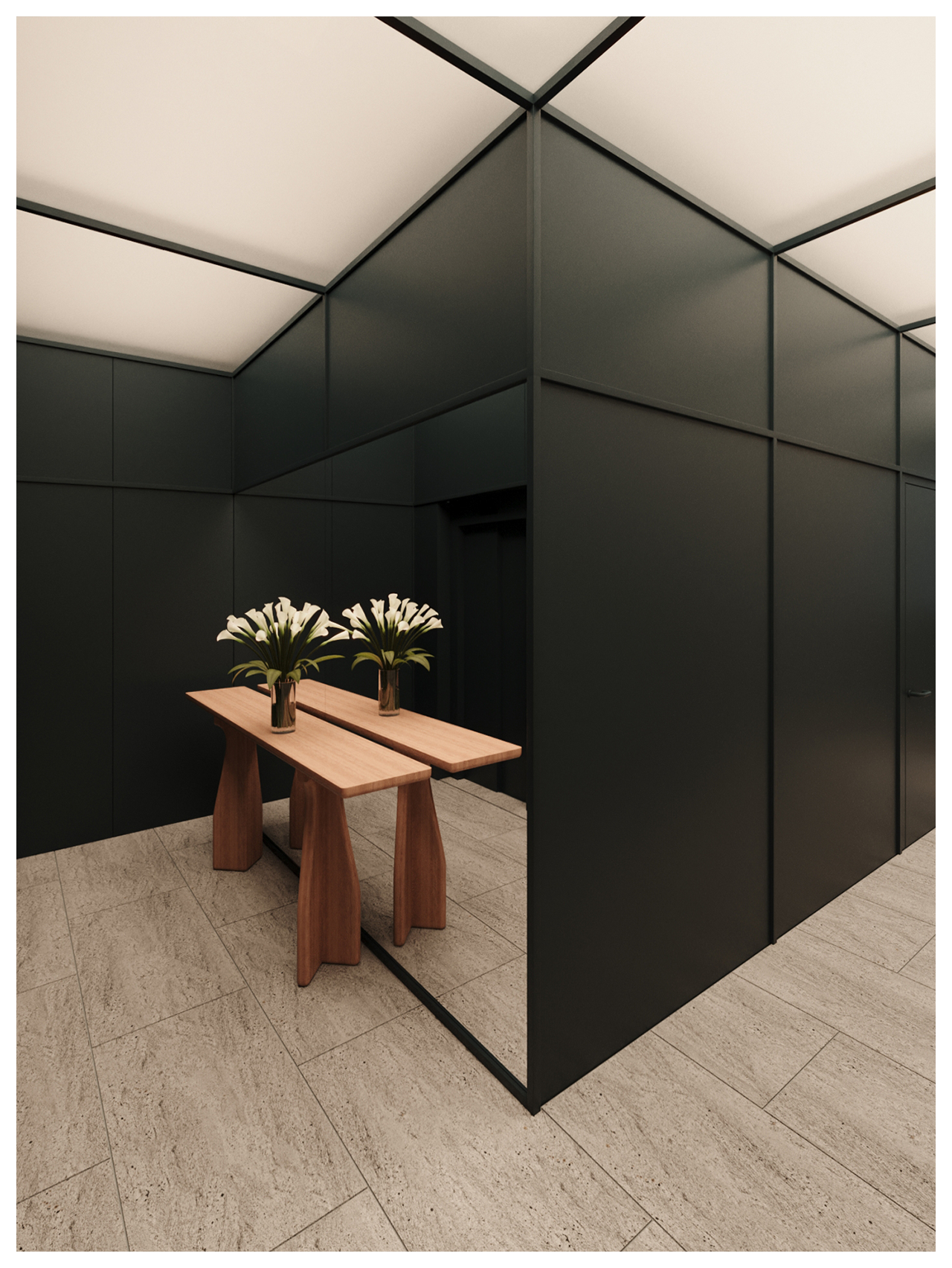 This project emerged from the invitation to rethink a condominium’s atriums as distinctive and defining spaces. The proposal takes the form of a metallic composition combined with light tables and stone walls, establishing a dialogue between weight and lightness. Its conceptual language is precise and expressive, defined by contrasts between surfaces, light, and materials. The result is a spatial composition with a strong sculptural presence.